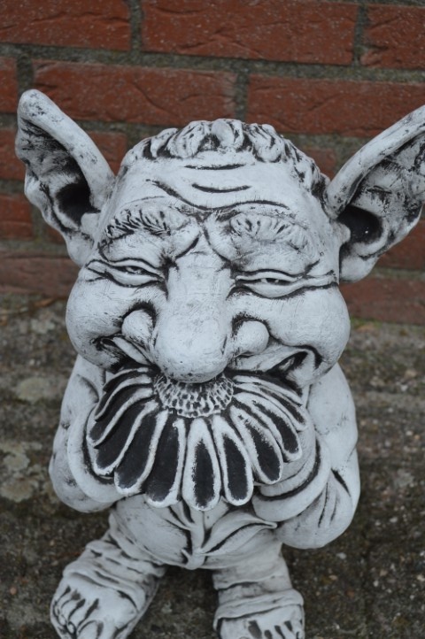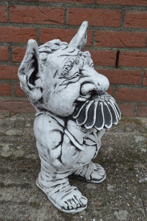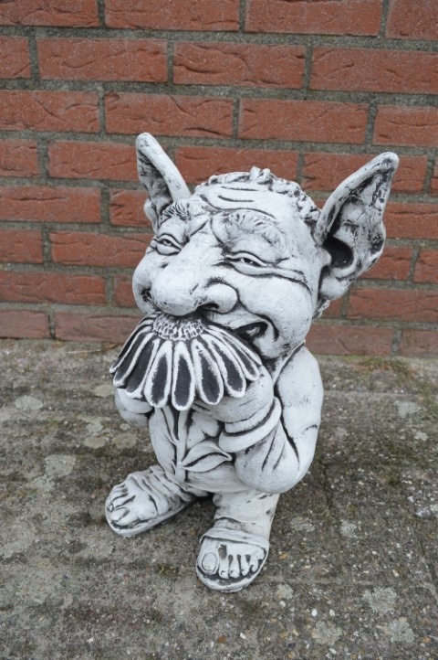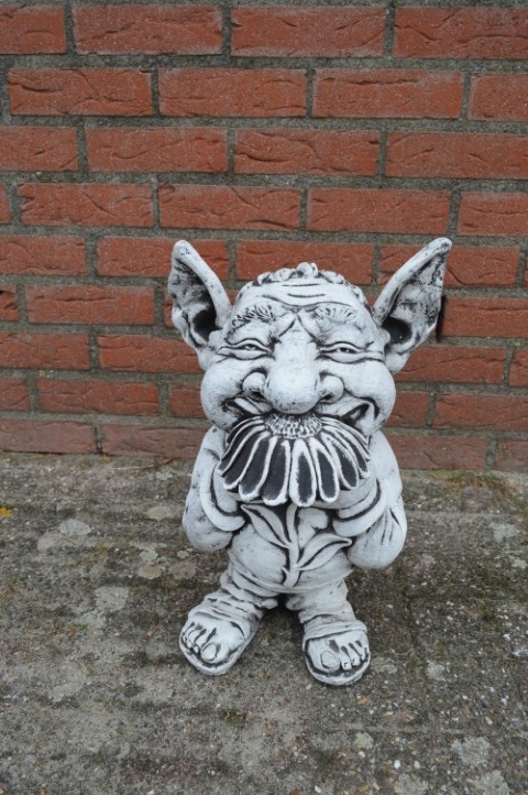 Deze trol van beton die aan een bloem ruikt is een vrolijk en ludiek beeld dat direct een glimlach opwekt. Met zijn neus diep in de bloem lijkt hij te zeggen: “Het leven is super!” — precies de positieve energie die iedere tuin of woonkamer kan gebruiken.