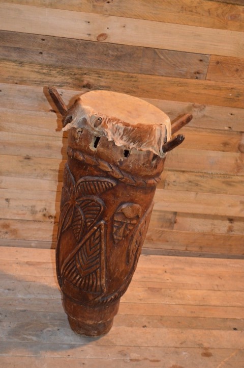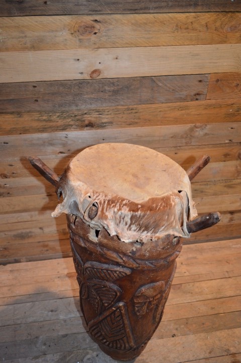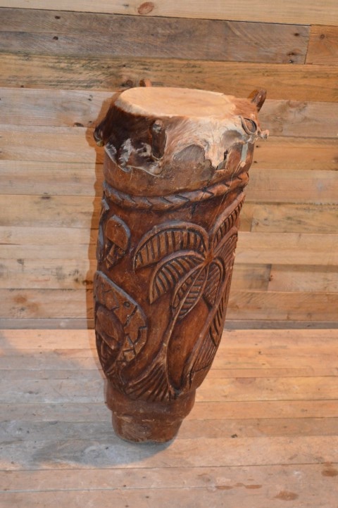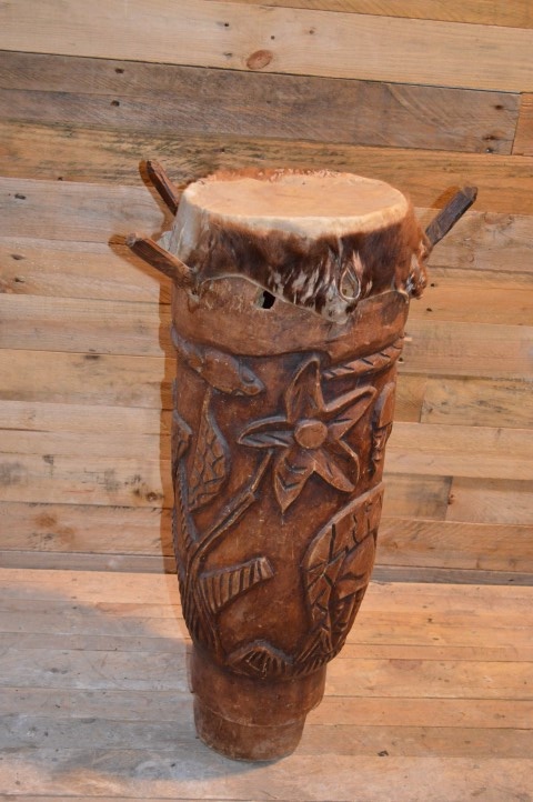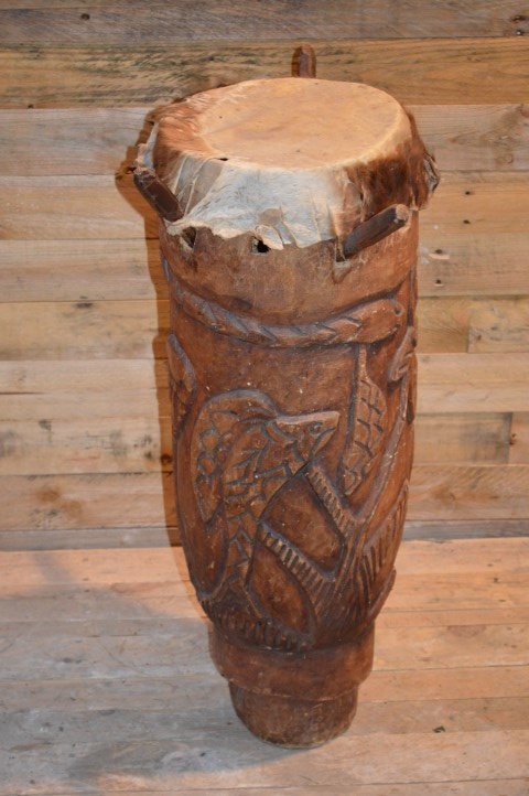 Afrikaanse handtrommel die sierlijk is bewerkt met veel houtsnijwerk en afbeeldingen. De bovenkant is bekleed met een leren huid/vel om op te trommelen met je handen. Deze djembe is erg mooi voor decoratie.