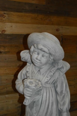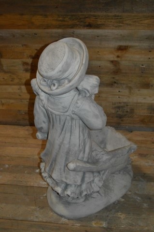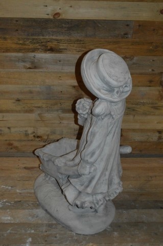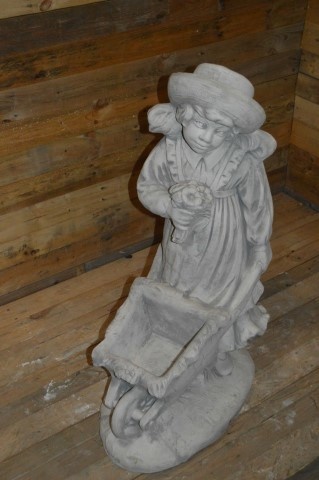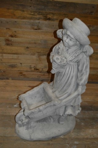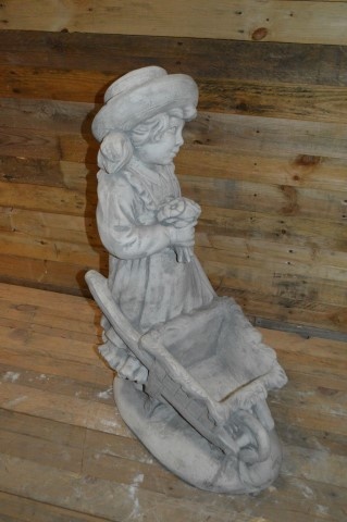 Dit meisje met haar kruiwagen is een prachtige plantenbak om uw tuin mee aan te kleden.