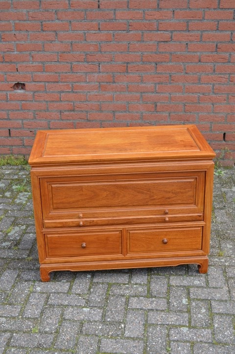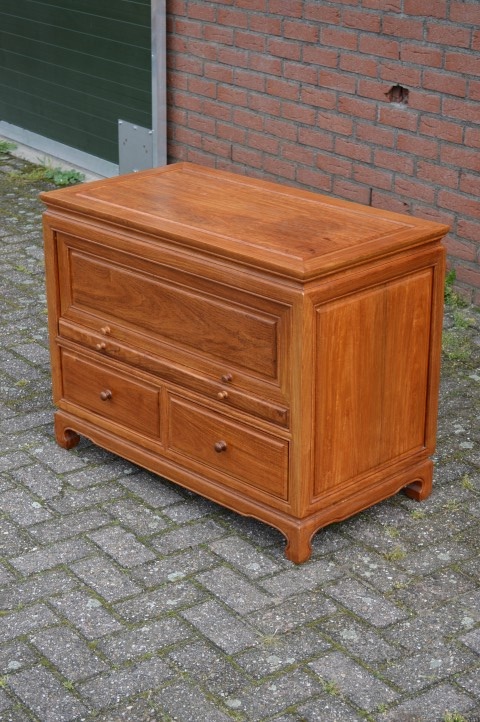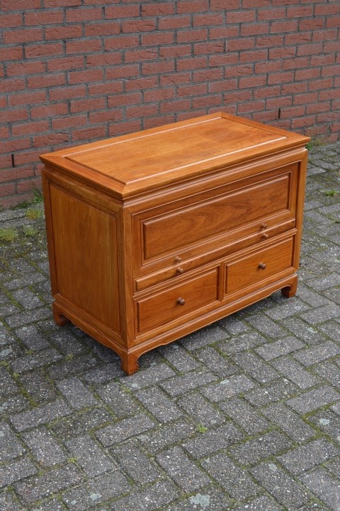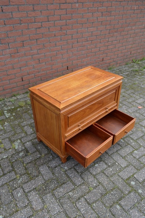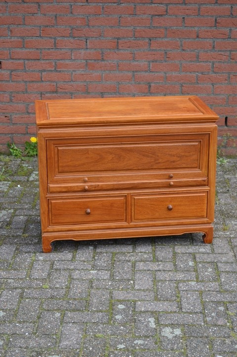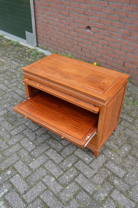 Licht houten commode om te gebruiken als tv-kastje. Een mooi laag kastje waar een TV op geplaatst kan worden terwijl in de kast zelf een uitschuifbaar plateau is waar u uw audio apparatuur op kan zetten. Het is ook een leuk kastje om als bijzetkastje te gebruiken. Onderin zijn twee lades. Het deurtje kan naar boven geschoven worden waardoor het plateau naar buiten kan worden getrokken.