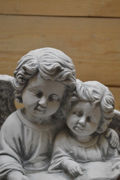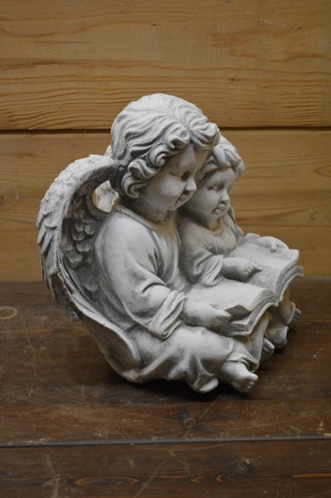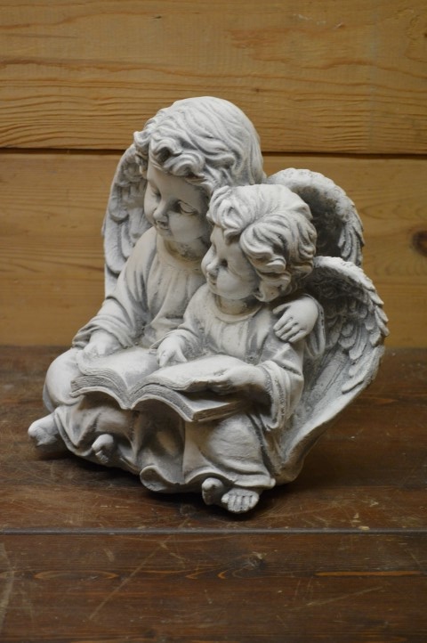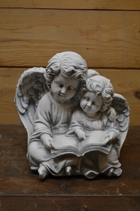 Dit beeld van engelen met boek toont twee engeltjes zittend naast elkaar. De grote engel leest voor uit een boek dat op hun schoot ligt, terwijl ze met een arm om de kleine engel heen zit. Een prachtig betonnen beeld, ook wel gietsteen genoemd, dat warmte en tederheid uitstraalt. Het staat prachtig als decoratief element in de tuin, op een graf, of op een gedenkplekje in huis. Dit liefdevolle tafereeltje spreekt jong en oud aan.