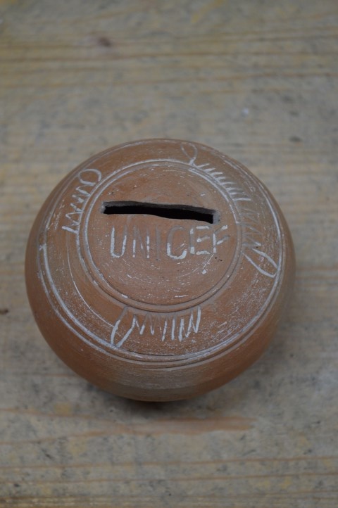 Dit eenvoudige ovale spaarpotje van bruin keramiek met Unicef inscriptie is ideaal voor een kind of kleinkind om het spaargeld veilig in te bewaren en ook leuk als decoratie voor op een kastje of tafeltje.