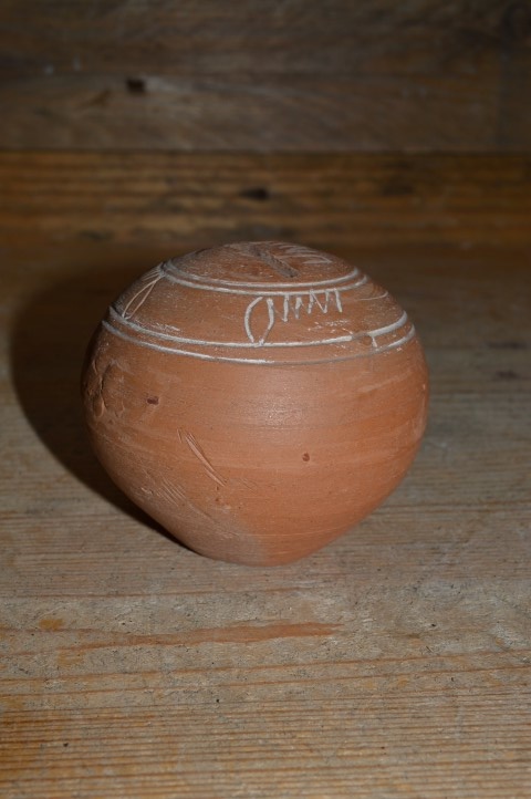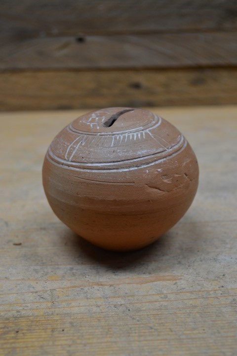 Omdat deze handbewerkte spaarpot eerder is gebruikt zijn er wel wat gebruikssporen aanwezig, maar deze kan desondanks verder nog goed gebruikt worden voor het sparen van geld of als aankleding van een interieur.