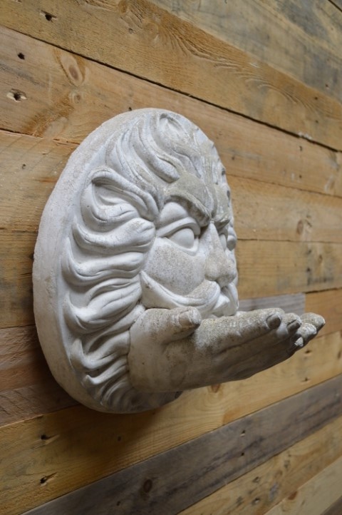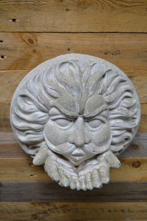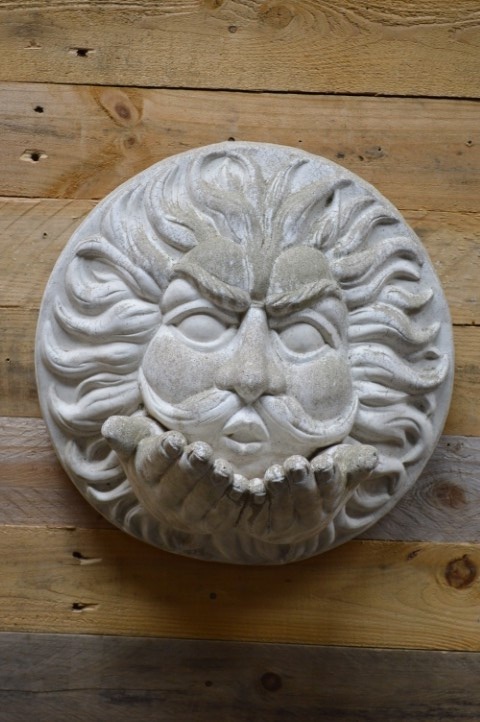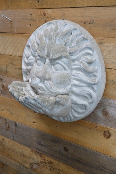 Betonnen windgezicht Vadertje Storm – Een sfeervolle wanddecoratie voor de tuin of muur: Vadertje Storm blaast de herfstwind uit zijn wangen, terwijl zijn handen dienst doen als voerbakje voor vogels. Dit beeld – ook wel bekend als Vadertje Herfst – is gegoten uit gietsteen en heeft een robuuste, klassieke uitstraling.Het ornament is niet alleen een blikvanger, maar ook functioneel: leg er in de winter wat zaadjes of vetbollen in en je helpt de vogels een handje.Dit tweedehands tuinbeeld heeft lichte gebruikssporen, wat bijdraagt aan het karakter van het ornament. Een unieke mix van decoratief én diervriendelijk.