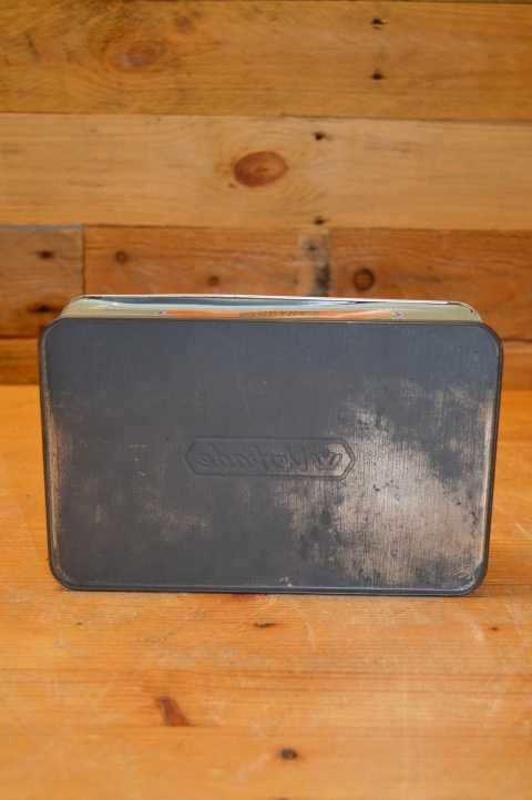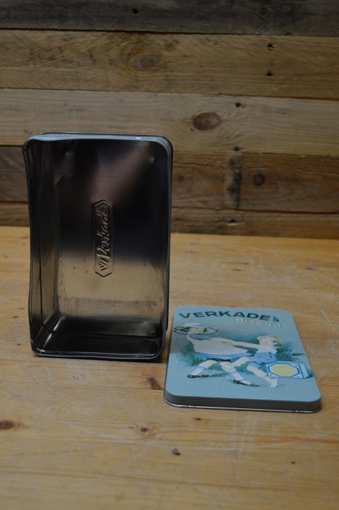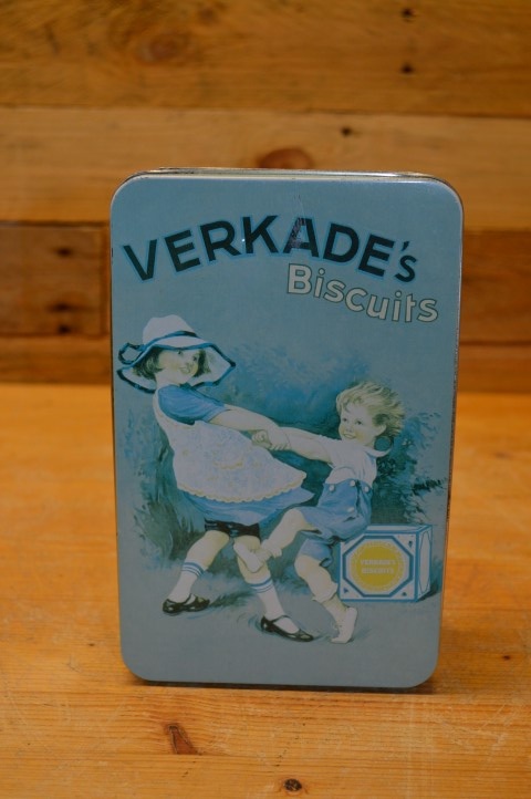 Koektrommel Verkade Biscuits met ouderwetse print van dansende kinderen. Deze vintage rechthoekige trommel met daarop een spelende jongen en meisje gemaakt voor Verkade's biscuits, Zaandam door Zaanlandia-Bekkers-Blik, Wehl in 1990. Echt zo'n koekjestrommel waar je van oma een koekje uit krijgt.