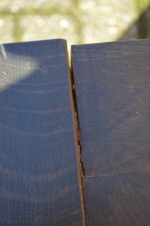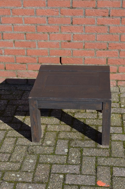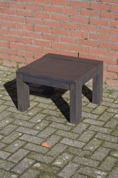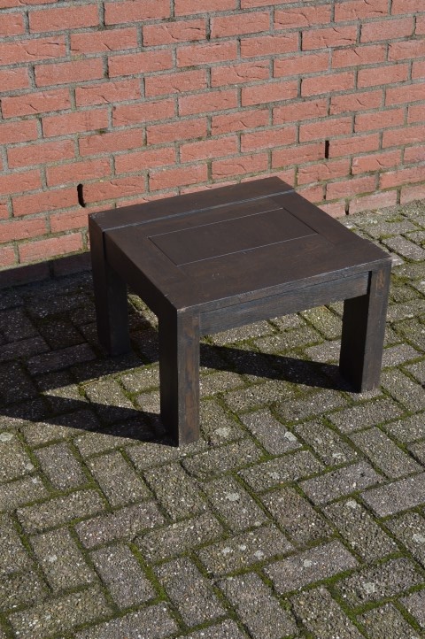 Stijlvol vierkant bijzettafeltje van massief eiken dat in een donkergrijze kleur is geschilderd. Handig voor als u weinig ruimte heeft en toch uw boek, tijdschrift of afstandsbediening binnen handbereik wilt houden. Het tafeltje heeft wel wat gebruikssporen opgelopen, maar met een beetje handigheid zal deze mooie bijzettafel nog jaren meegaan.