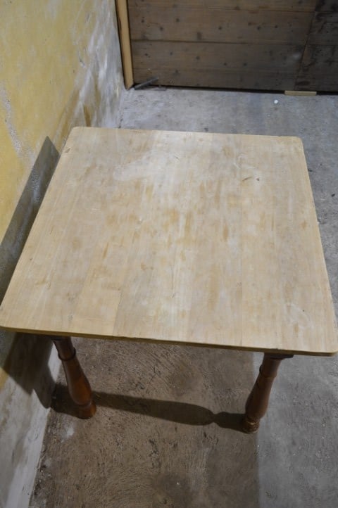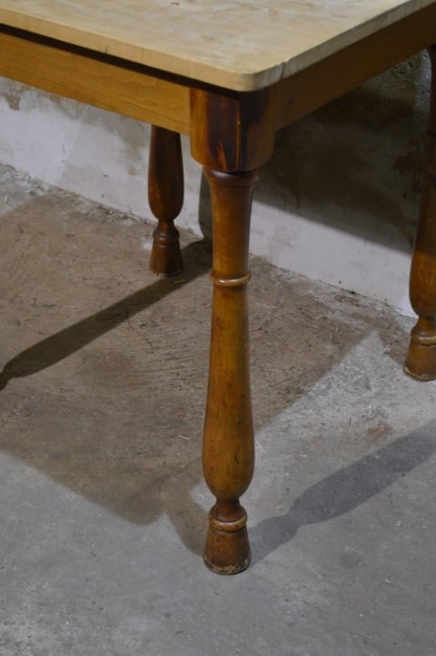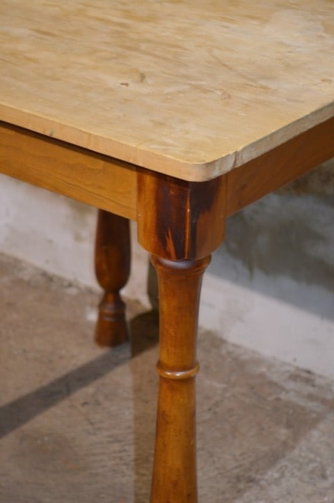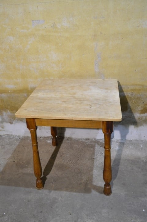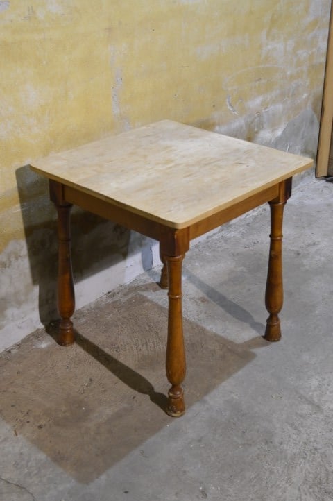 De tafel is tweedehands en heeft gebruikssporen. Het blad is niet origineel, wat bijdraagt aan het unieke karakter van het meubel.