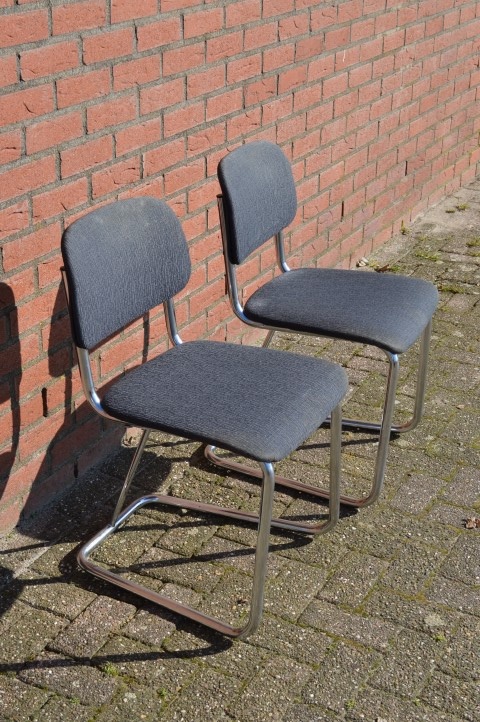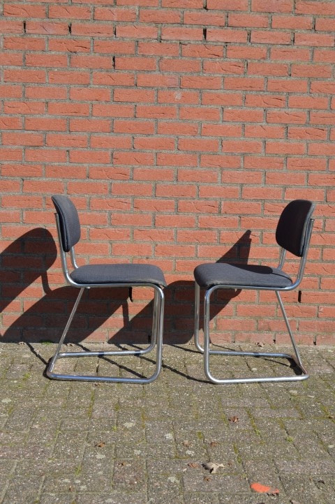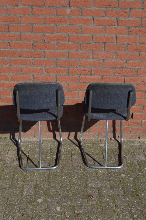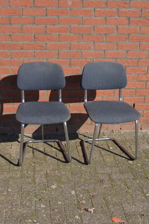 Lande Jami sledestoel met een stalen buizen frame die verchroomd is en een grijskleurige stoffering op de zitting en rugleuning. Deze set van 2 stoelen zijn aan de onderkant gemerkt met stempels uit 1972 met het merk Markant en Van der Linden.