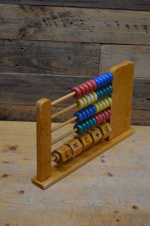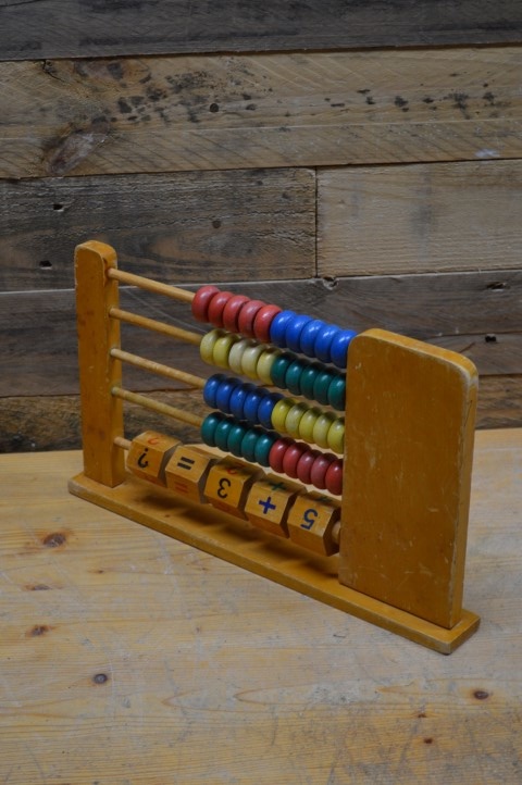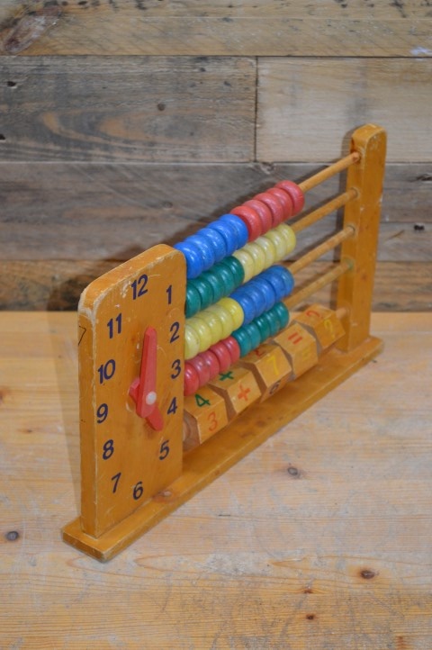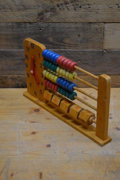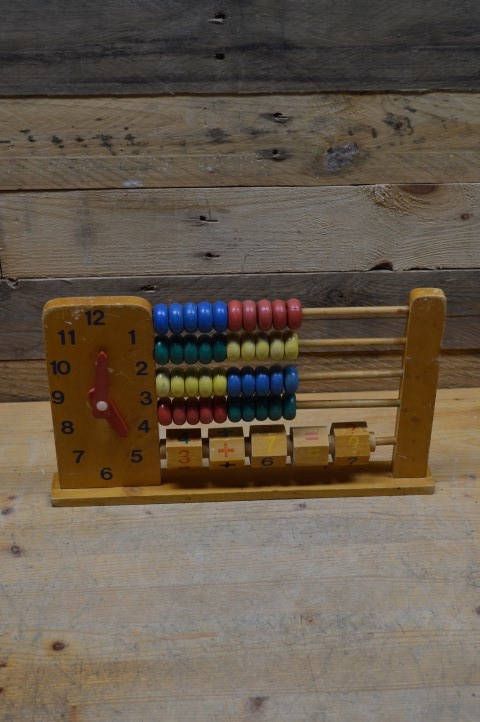 Met dit stevige vintage leerraam van hout, ook wel telraam of abacus genoemd, maakt uw peuter of kleuter op de ouderwetse manier spelenderwijs kennis met de wereld van kleuren, getallen en het klokkijken.