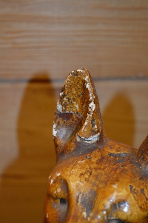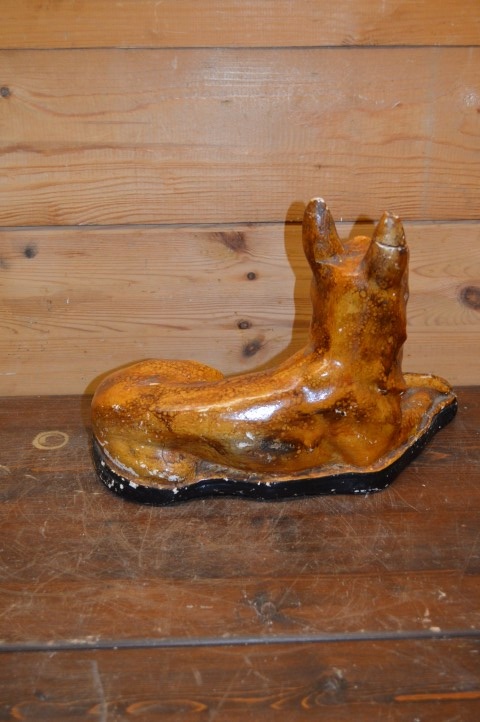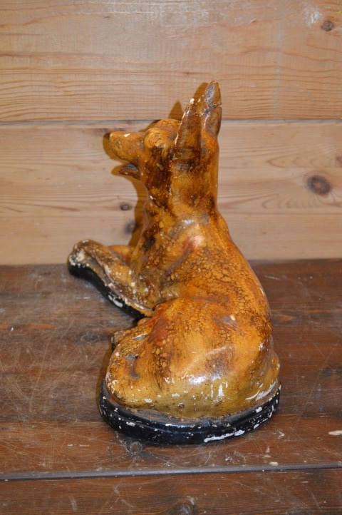 Dit Vintage liggende herdershond beeld is een prachtig tweedehands exemplaar gemaakt van geglazuurd gips. De hond ligt rustig neer met een alerte blik, en het beeld straalt een stoere charme uit. Door de jaren heen heeft dit beeld het nodige meegemaakt: er zijn sporen van oud lijmwerk zichtbaar waar het ooit beschadigd is geweest. Toch draagt dit juist bij aan het karakter van dit decoratieve object. Perfect voor hondenliefhebbers of als sfeervolle toevoeging aan een nostalgisch interieur.