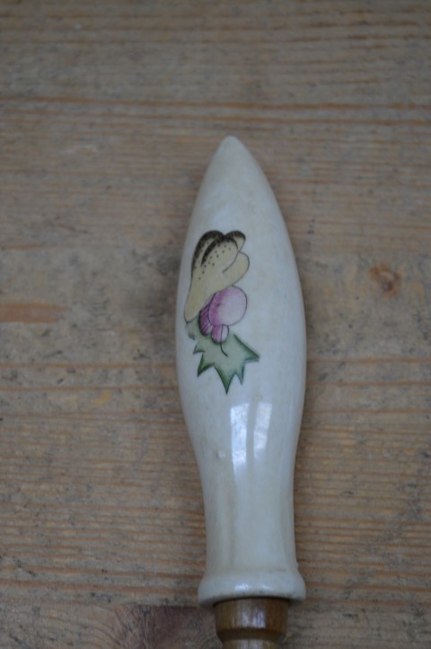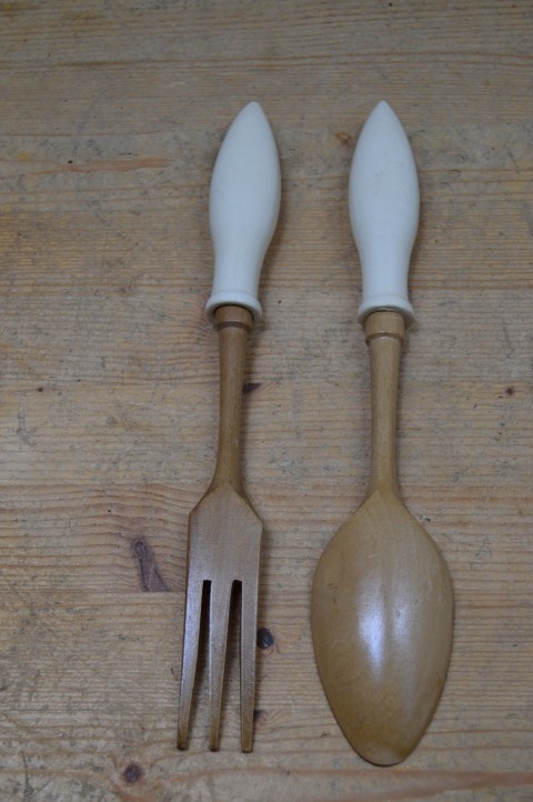 Vintage slabestek van kunststof met een porseleinen handvat. Typisch mid-century sla lepel en vork om de sla of salade mee op te scheppen. De keramiek handvaten zijn vrolijk versierd. In het begin van de jaren 60 werd veel geëxperimenteerd met het ontwerpen en maken van gebruiksvoorwerpen in het huishouden. Dit retro sla bestek is daar een sprekend voorbeeld van.