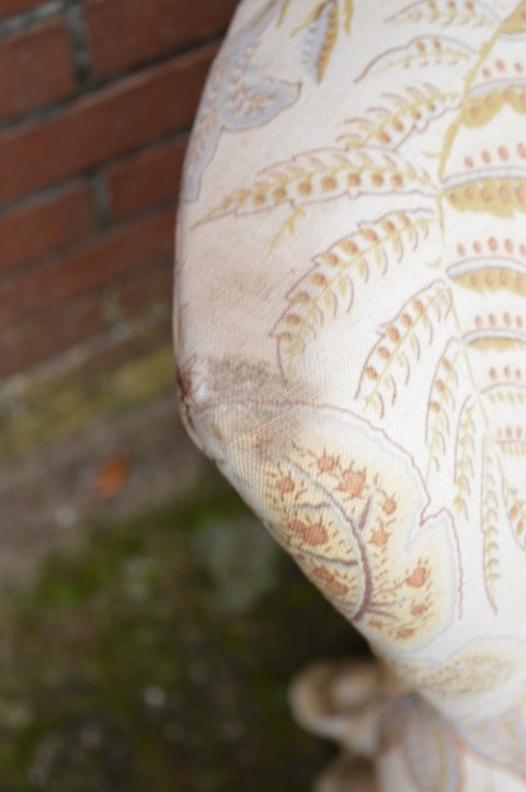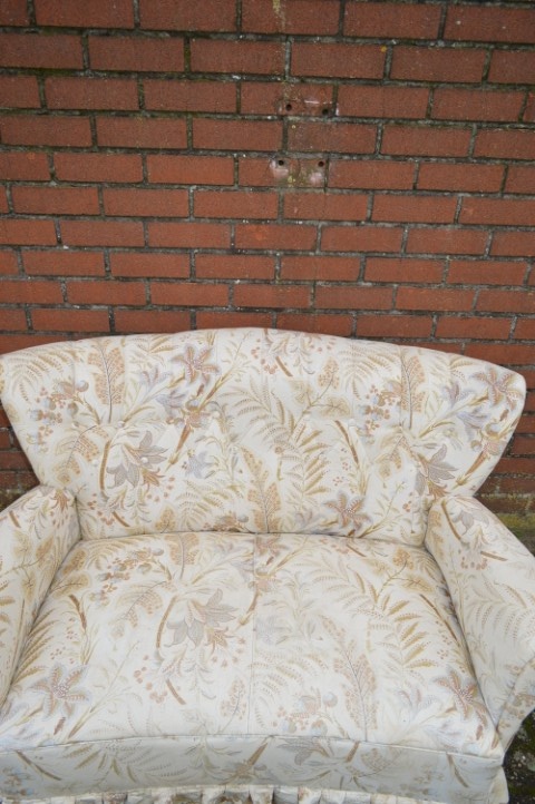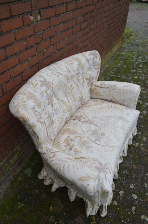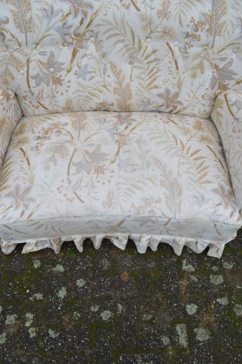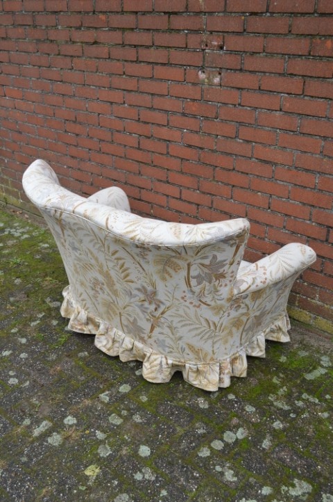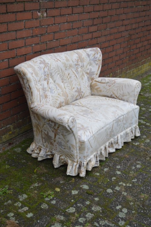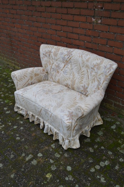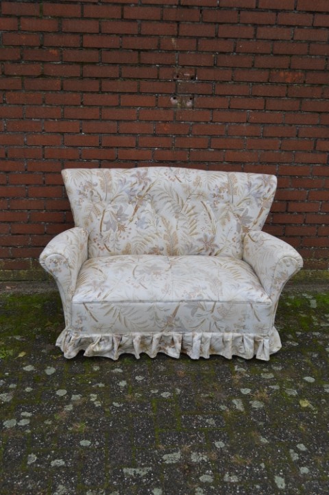 Het tweedehands bankje voor twee personen heeft lichte gebruikssporen en enkele kleine vlekjes in de stof, wat bijdraagt aan zijn authentieke vintage charme. Perfect voor in de woonkamer, slaapkamer of als decoratief accent in een gezellige hoek – een uniek en karaktervol meubelstuk dat sfeer toevoegt aan elke ruimte.