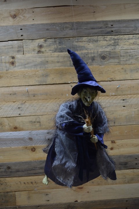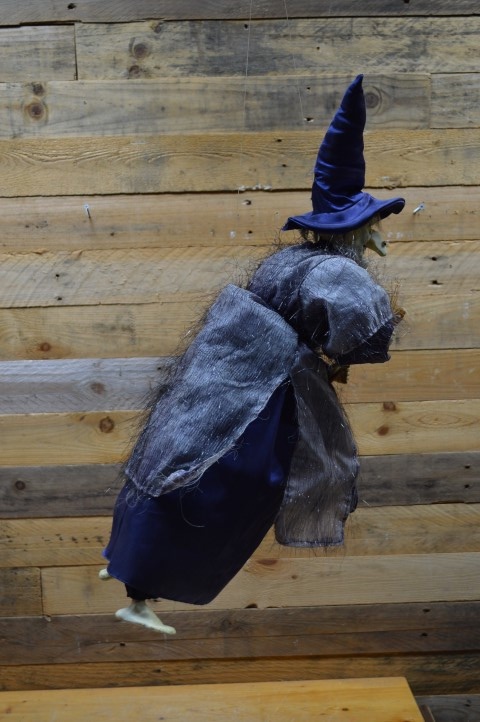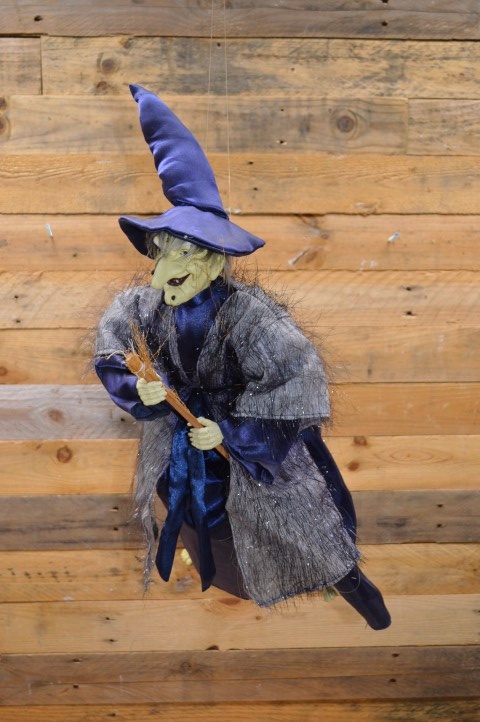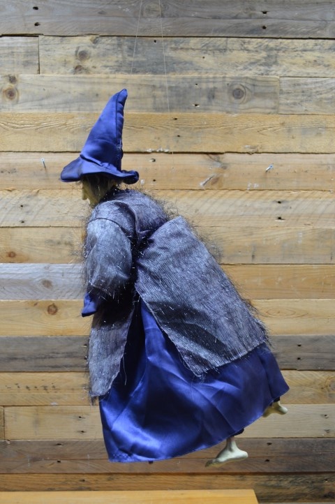 Ouderwetse vliegende heksenpop met blauwe hoed op een bezem. Deze pop is ideaal als vintage decoratie in huis en kan overal goed hangen, zoals boven een kast, voor het raam of bij de deur.