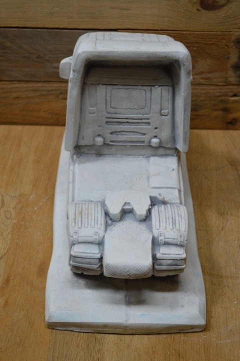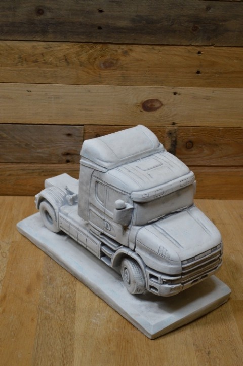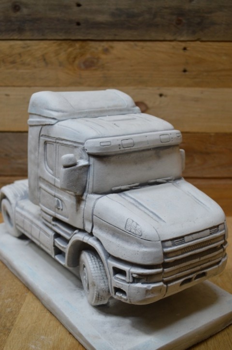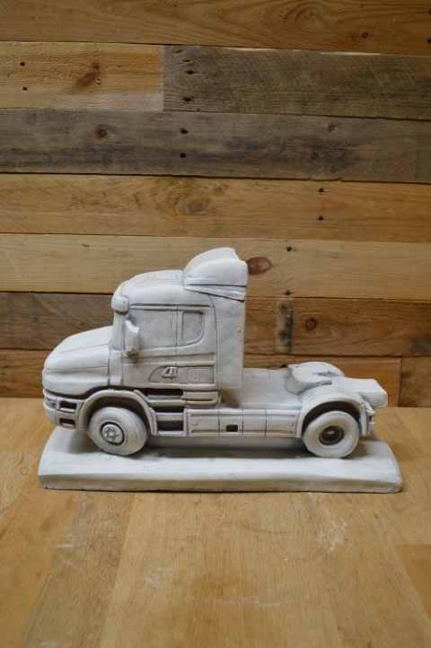 Deze tuinbeeld vrachtwagen met torpedofront is een prachtig gedetailleerd schaalmodel van beton. De vrachtwagen is uitgevoerd zonder oplegger en heeft een brede neus en een lang front, zoals kenmerkend voor een torpedofront. Dit betonnen tuinbeeld is los al een stoere eyecatcher, maar is ook uit te breiden met een bijpassende oplegger die tevens dienst kan doen als plantenbak. Perfect voor vrachtwagenliefhebbers en als robuuste tuin- of erfdecoratie.