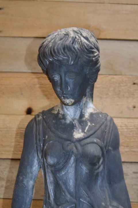 Polyester beeld Romeinse vrouw met bloemen – Dit tweedehands beeld toont een sierlijke Romeinse vrouw in golvende rokken, net op het moment dat ze een tuil bloemen geplukt heeft.Het beeld is gemaakt van polyester en heeft door jarenlang buitengebruik een geleefd, verweerd uiterlijk gekregen. De kleuren zijn licht vervaagd en er zijn gebruikssporen zichtbaar.Juist die sporen van de tijd geven het beeld karakter – een echte sfeermaker voor tuin, hal of serre.Zoals bij al onze producten geldt: het betreft een gebruikt item met een verleden. Bekijk daarom goed de foto's voordat je tot aankoop overgaat.