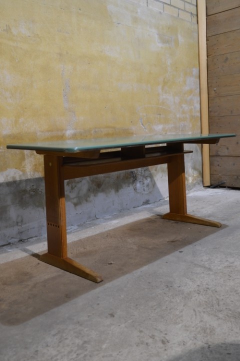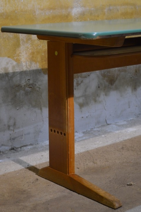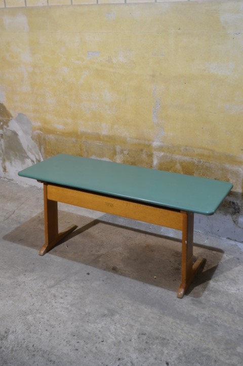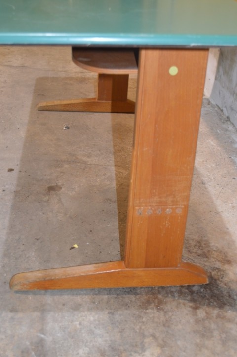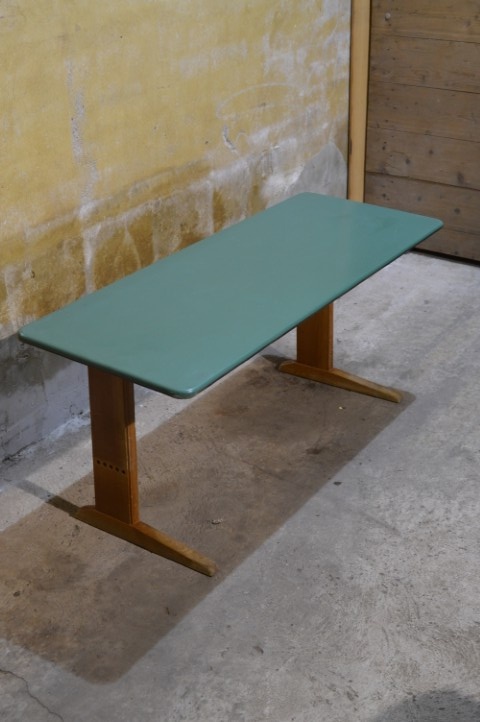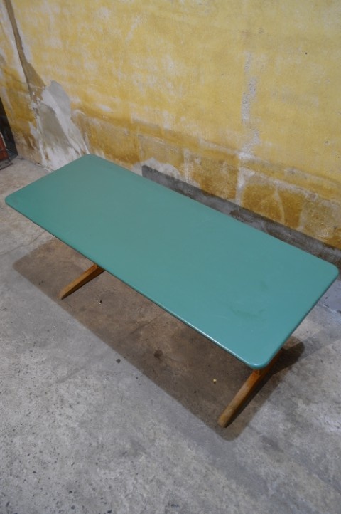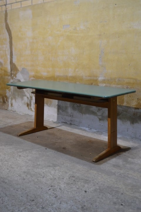 De tafel verkeert in originele staat met normale gebruikssporen zoals krassen en lbeschadigingen, wat bijdraagt aan het authentieke karakter.