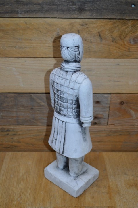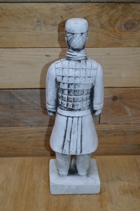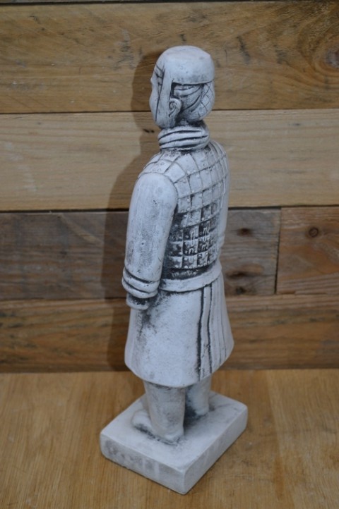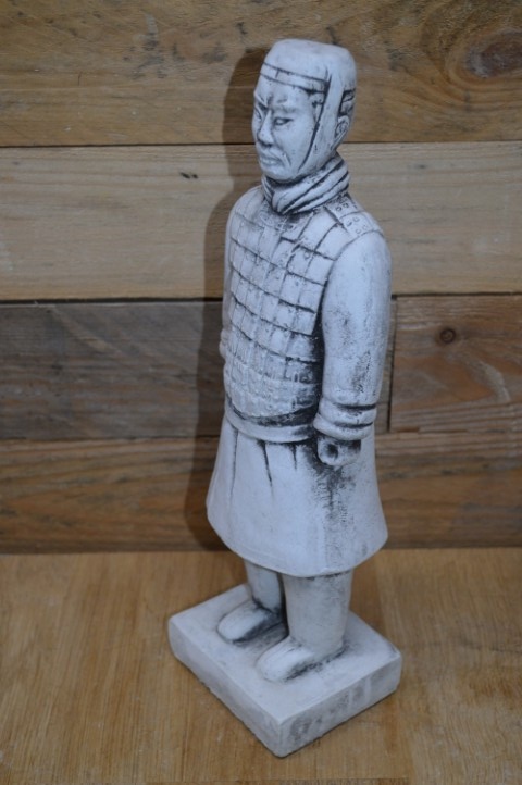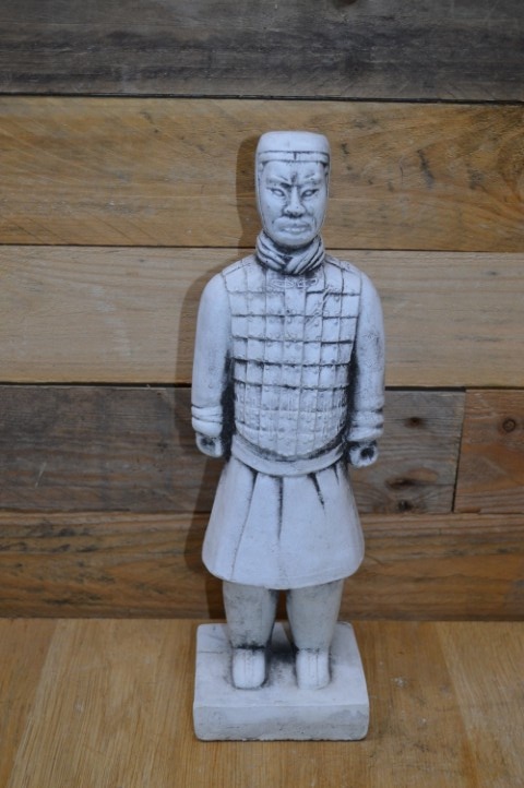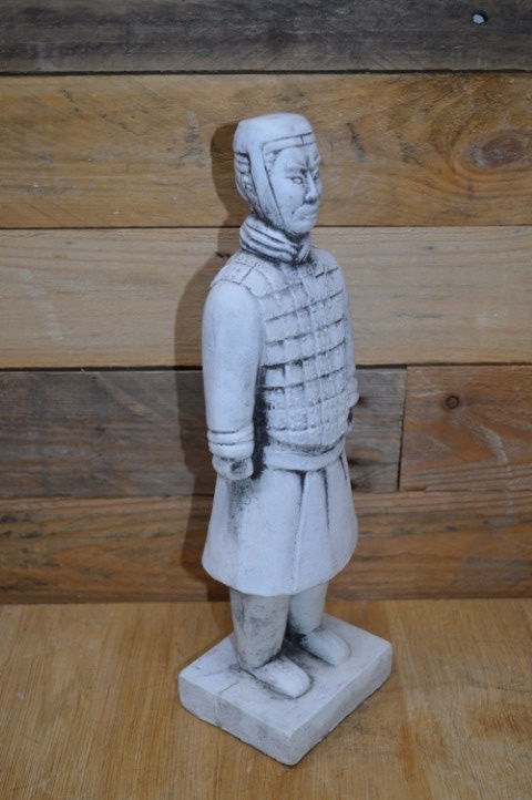Dit Chinese krijger tuinbeeld is een imposant betonnen beeld, geïnspireerd op het beroemde terracotta leger uit China. Het beeld stelt een soldaat of poortwachter voor en is perfect geschikt voor plaatsing in een rustige tuin, bij een vijver of als decoratief element op een sokkel bij een oprijlaan of voordeur. Gemaakt van weerbestendig beton en dus geschikt voor buitengebruik. Dit exemplaar is tweede keus: er kan een vlekje of kleine imperfectie op zitten, maar dat doet niets af aan de uitstraling en sierwaarde van dit indrukwekkende tuinbeeld.