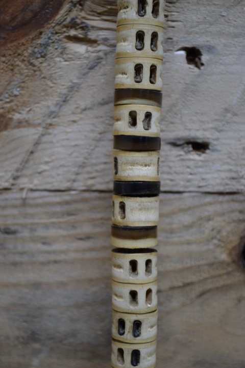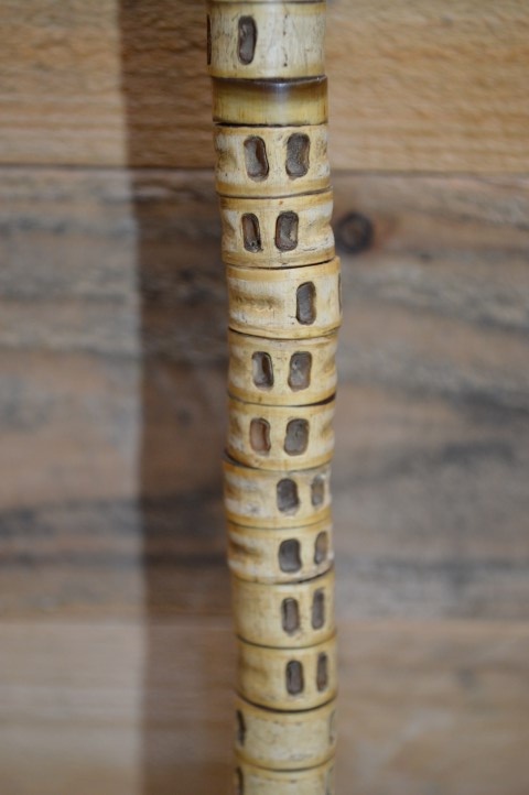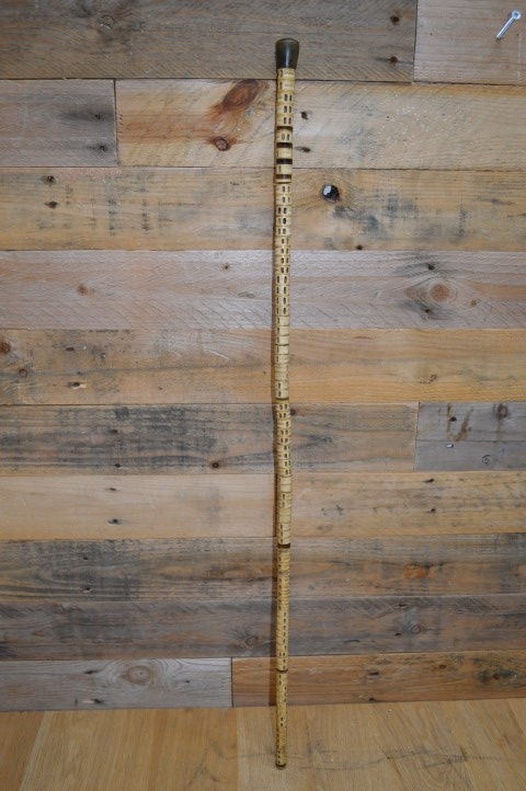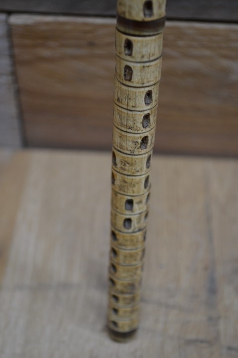 Walvis Wandelstok, zoals ze genoemd worden maar feitelijk gemaakt van haaien wervels. De wervels van een haai zijn over een metalen staaf geregen, met de grootste wervels bovenaan. Hoogst waarschijnlijk gemaakt door een zeeman op de grote vaart tussen 1880 en 1920. Heren met een grote beurs liepen met dergelijke wandelstokken te pronken.