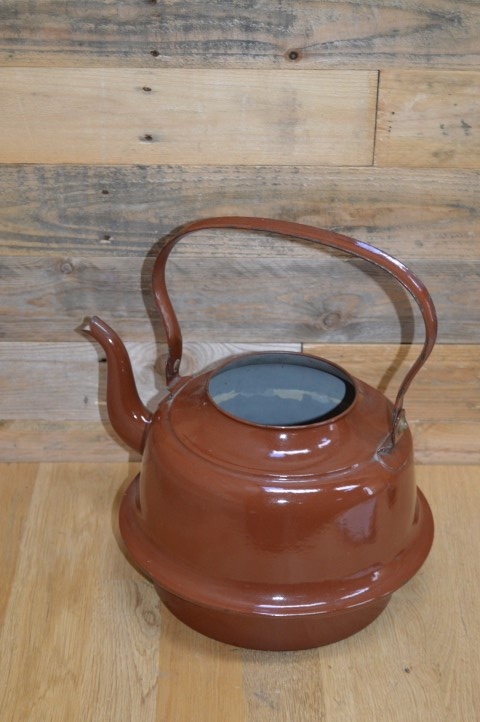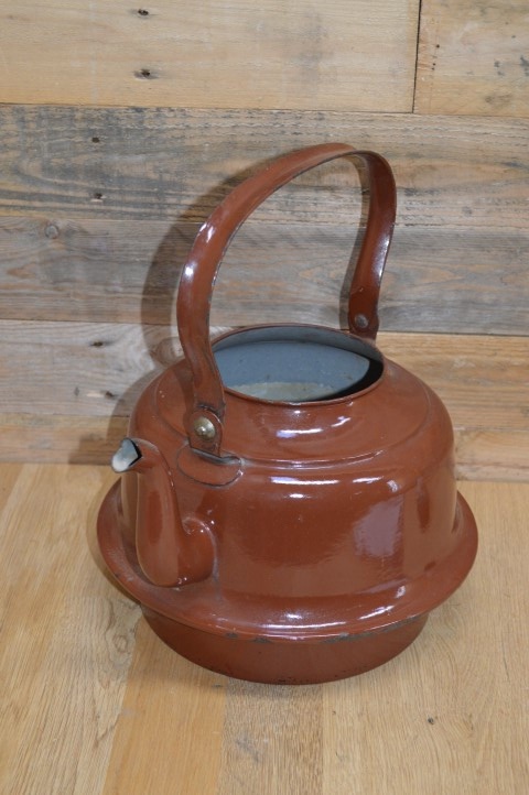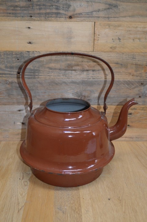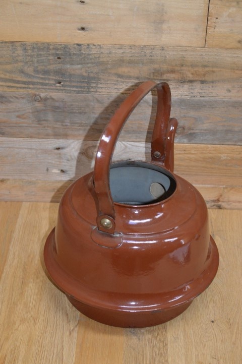 Retro waterketel donker bruin emaillen. Mooie decoratie voor op een kachel of als gieter om planten mee watrer te geven. Dit soort ketels stonden op de kolen fornuizen om altijd kokend water bij de hand te hebben maar worden nu ook veel gebruikt als decoratie in huis.