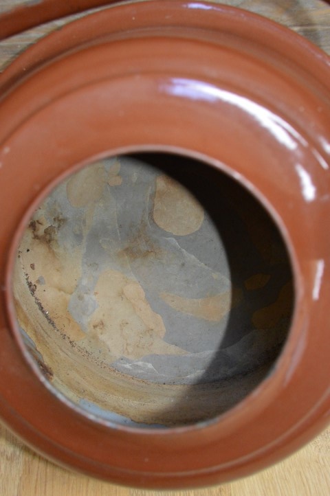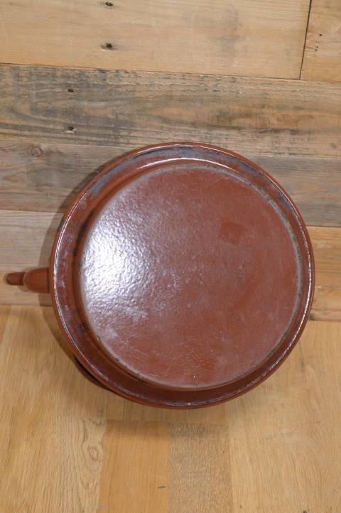 Hoewel deze mooie ketel van geëmailleerd metaal in goede gebruikte staat is heeft hij wel enige gebruikssporen opgelopen bij het gebruik in het verleden. En is er geen deksel meer bij.