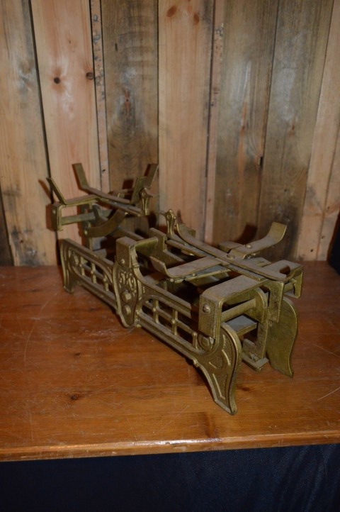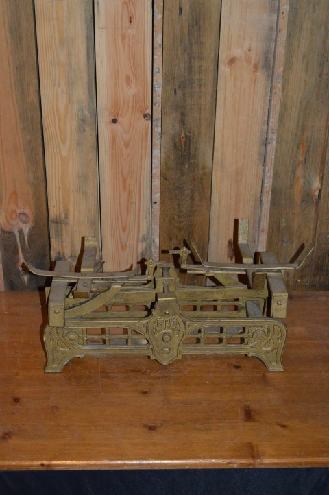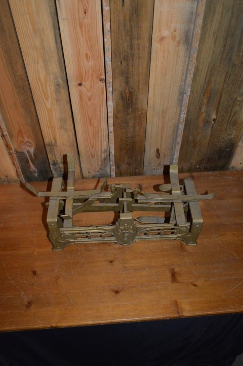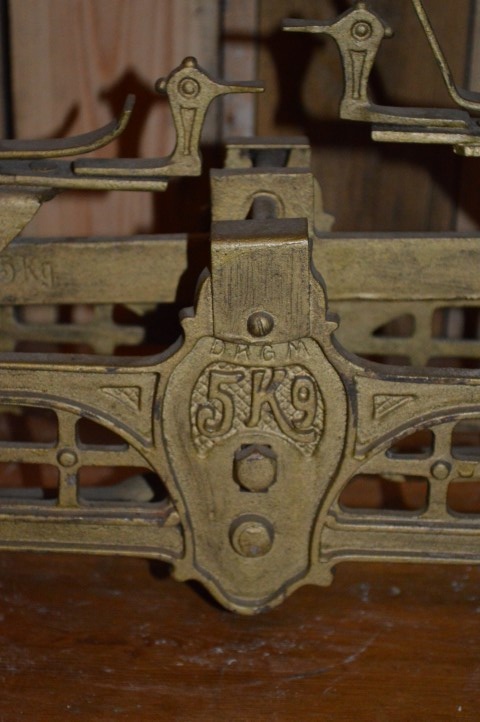 Retro gietijzeren weegschaal voor maximaal 5 kg uit het begin van de 20ste eeuw gemerkt met het Duitse keurmerk DRGM (Deutsches Reich gebrauch Muster) Deze vintage bascule weegt op twee schalen. Vaak werden deze bascules in drogisterijen als toonbank weegschaal gebruikt nu meestal gebruikt als decoratie.