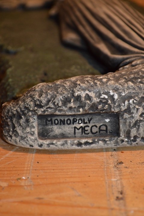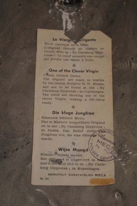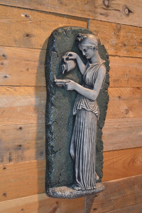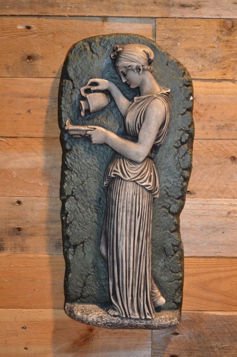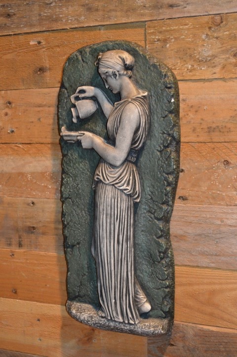 Zeer mooie zware wandplaquette van godin Hebe, de wijze maagd, in reliëf. Mooie plaque van een Bijbelse afbeelding van Godin Hebe. Het object is gemaakt in 1960 en is een reproductie waarvan het origineel zich in Denemarken bevindt. Aan de achterzijde is een uitleg te vinden met een stempel van kunstatelier Monopoly Meca, Holger Danske met patent nummer 708. De achtergrond van de vrouw is meer groen van kleur.