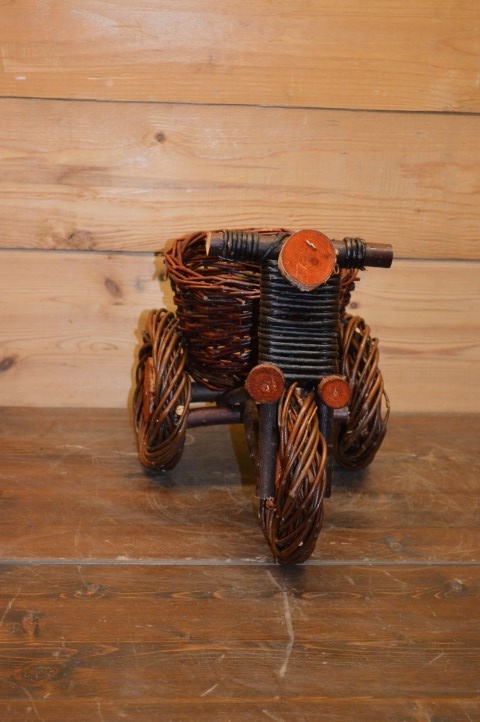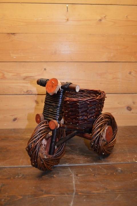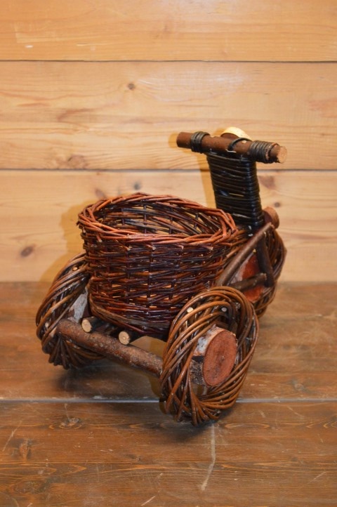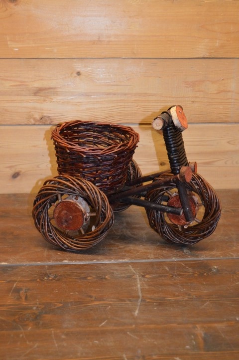 Driewieler fiets van wilgentenen met een bakje. Plantenbakje gevlochten uit wilgentenen is een geweldig decoratief met de hand gevlochten plantenbakje voor binnen of buiten.