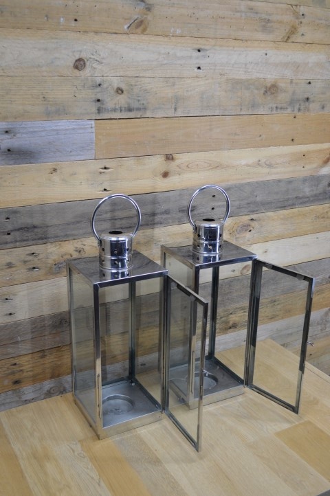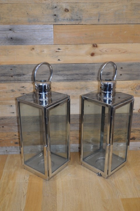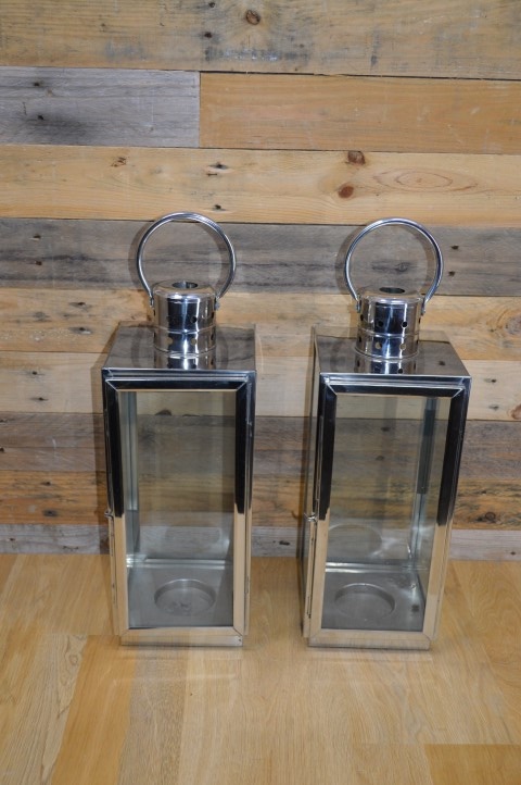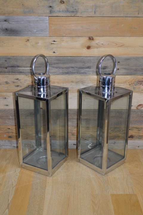 Twee decoratieve windlichten van glas en RVS metaal die als decoratie of sfeerlicht op tafel kunnen worden neergezet. Een leuke toevoeging aan het interieur voor zowel binnen als buiten.