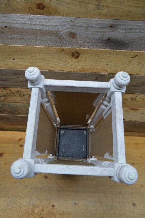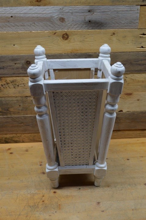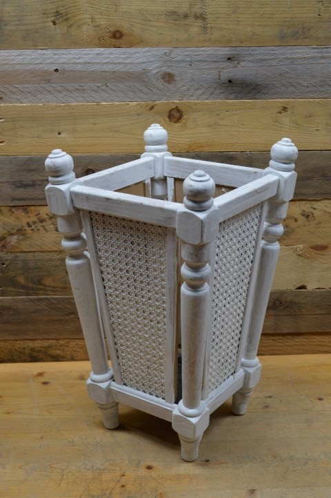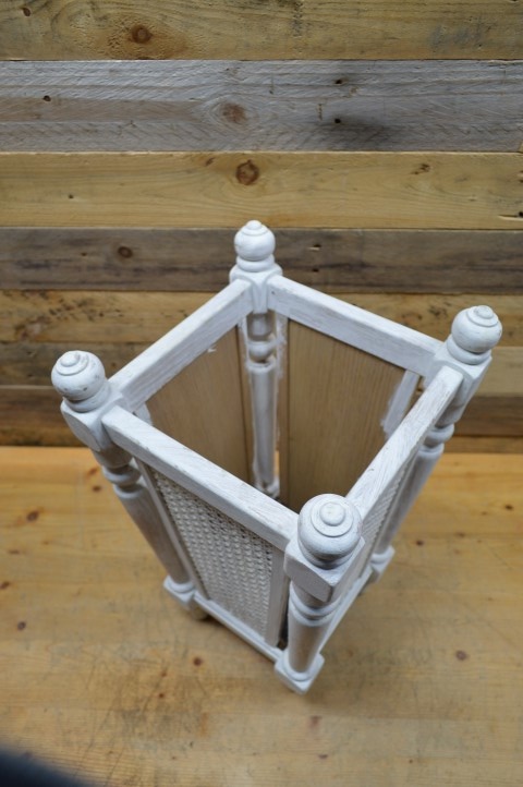 Stevige wit geschilderde houten paraplubak met webbing. Deze parapluhouder is een echte blikvanger in de gang en zorgt dat alle paraplu's netjes opgeborgen kunnen worden zodat het regenwater niet op de grond terecht komt.
