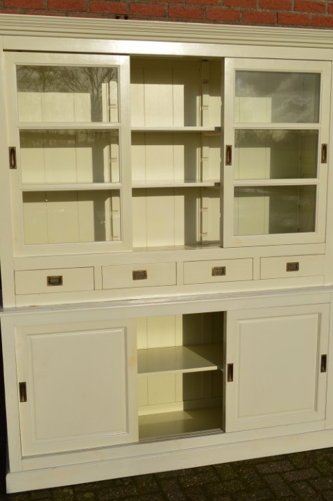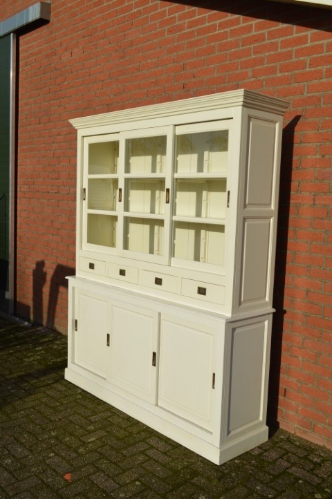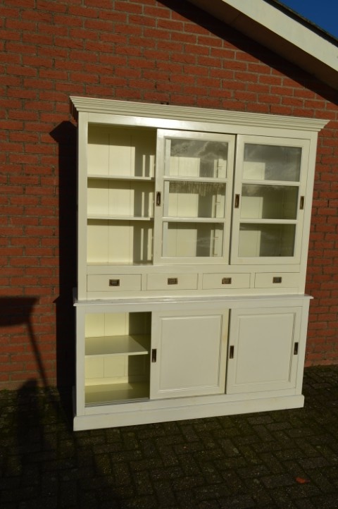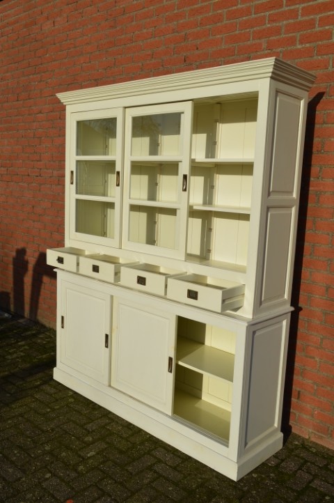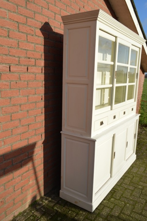 Deze witte vitrine servies kast is een mooie grote buffetkast van massief grenenhout met een dichte onderkast met laden en glazen deuren in de bovenkast. Een kast met vele mogelijkheden zowel in de woonkamer als in de keuken. Deze mooie wandkast biedt veel opbergruimte voor spullen die je graag uit het zicht hebt in de onderkast en in het glazen gedeelte kan je pronken met je mooie porseleinen servies of leuke persoonlijke spullen.