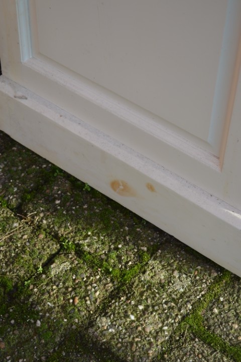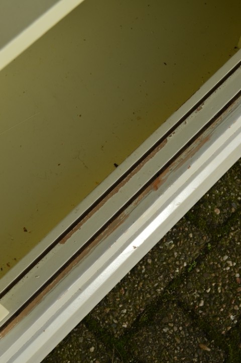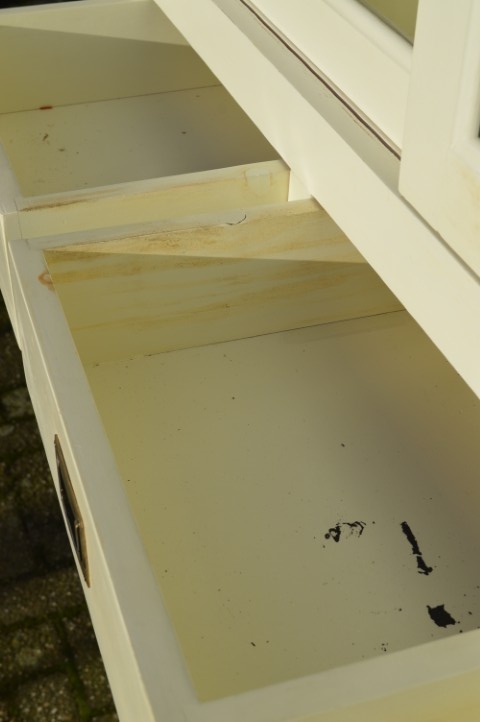 Het is een tweedehands wandkast met gebruikssporen. De kast heeft diverse slijtplekken en de witte kleur is verkleurd door de zon op een paar plekken. 1 handgreepje is gebroken.