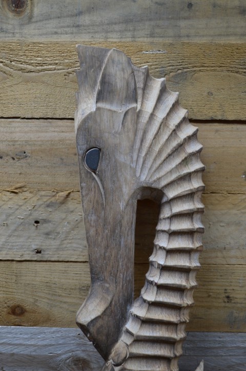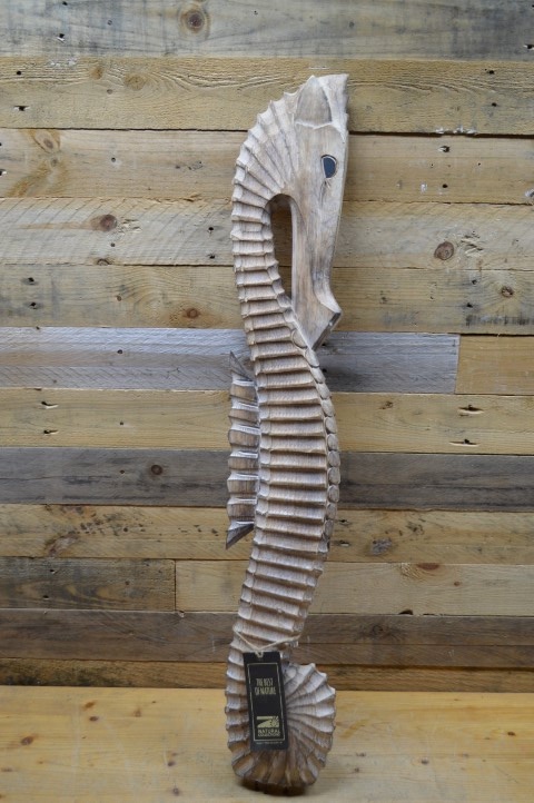 Zeepaardje van hout. Een zeer groot tweedehands decoratie zeepaardje uit de collectie van Dijk Natural Collection. Erg mooi op een royale lege muur of tegen een glazen tussenwand. Dit zeepaardje is gemaakt van duurzaam gecertificeerd hout uit Indonesië.