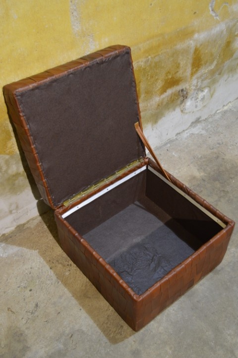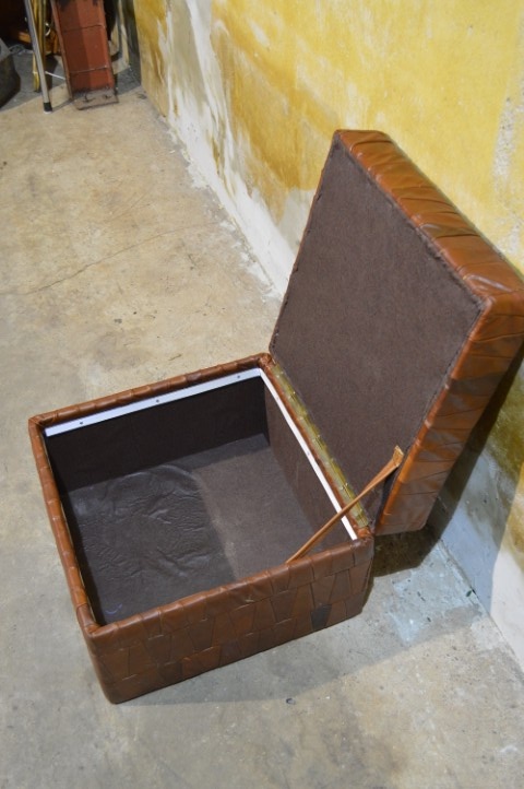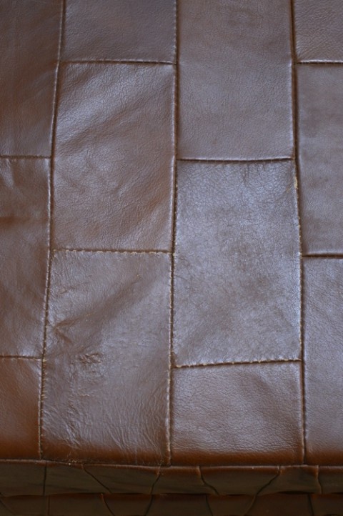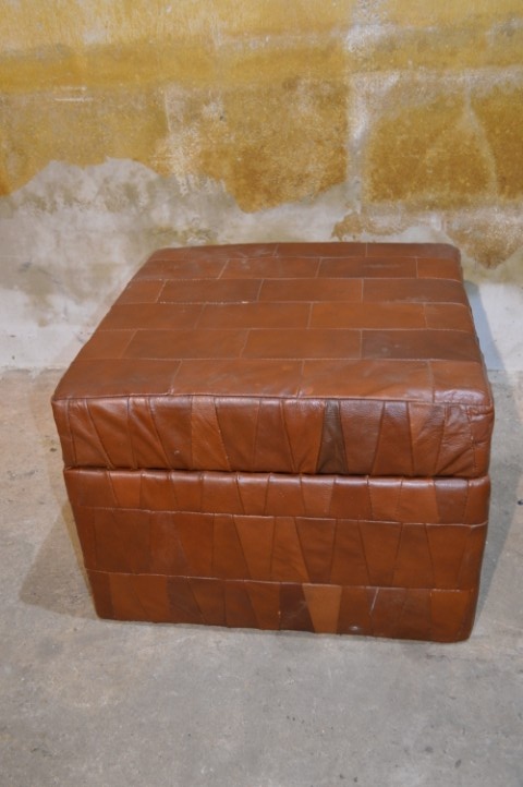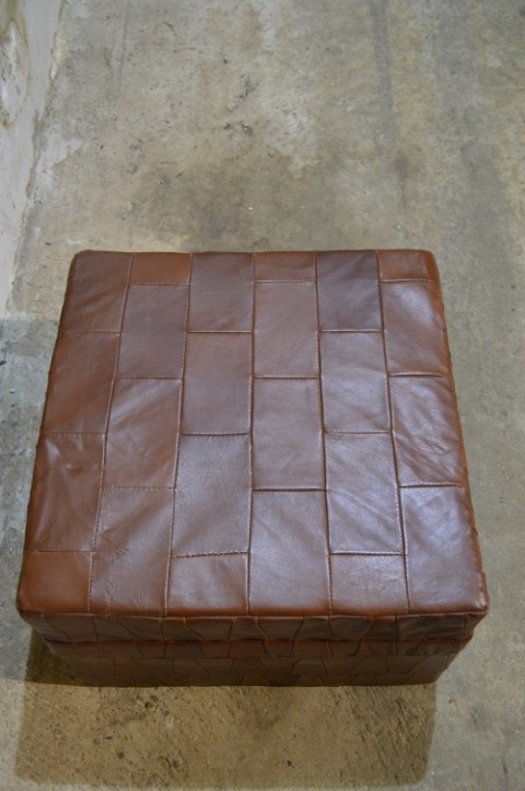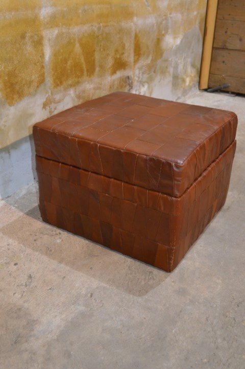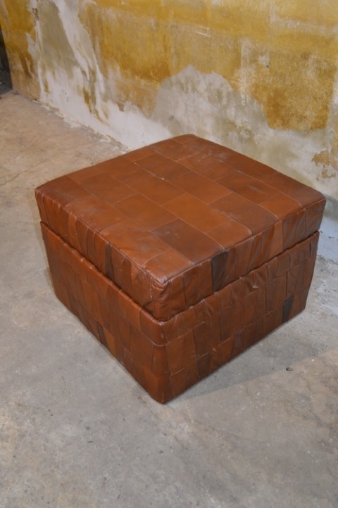 Deze vintage leren hocker met patchwork is een sfeervol en praktisch meubelstuk.