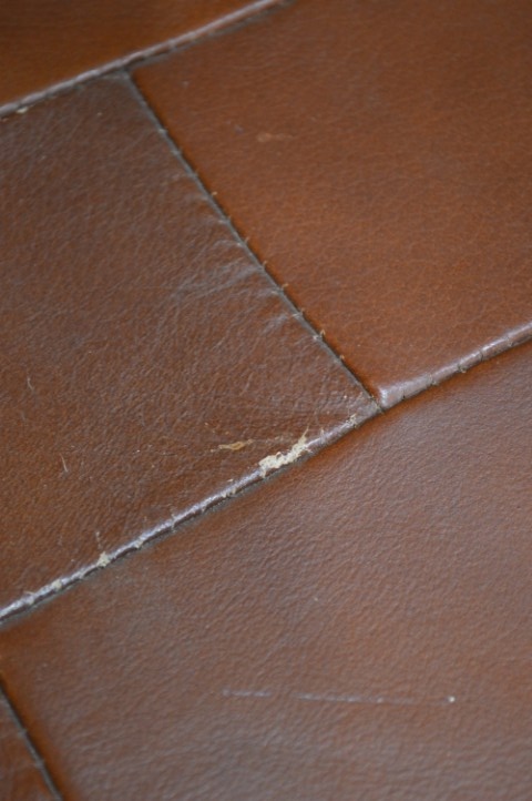 De hocker is bekleed met leer en heeft een warme uitstraling door de verschillende tinten en de natuurlijke patina.