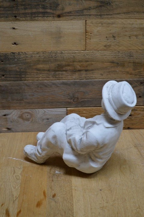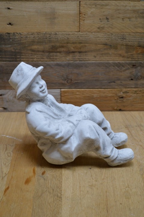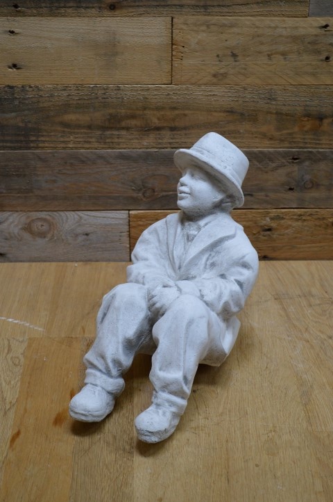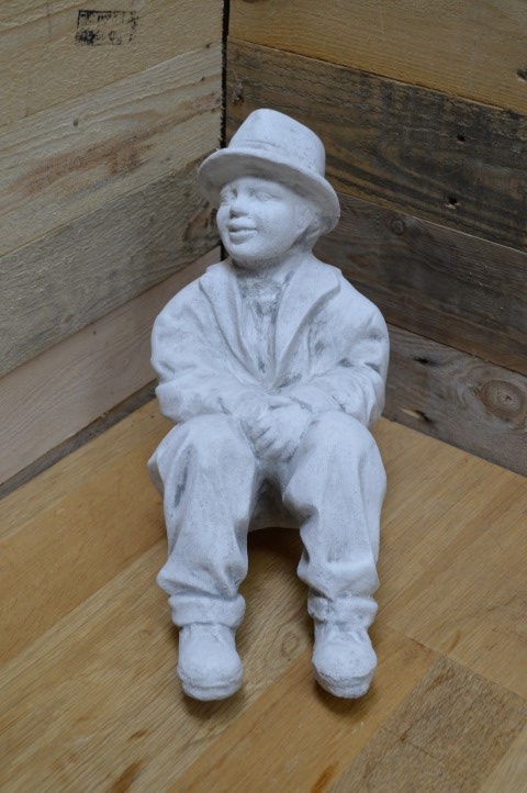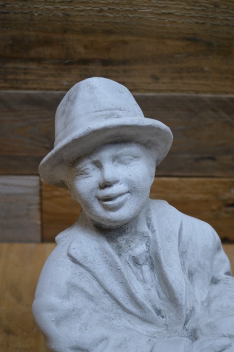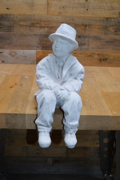 Betonnen beeld mannetje met hoed zittend – Dit vrolijke jonge ventje zit rustig op de rand van een muurtje, vijver of zuil. Hij kijkt dromerig voor zich uit, alsof hij wacht op een avontuur of gewoon geniet van de zon.Het beeld is gemaakt van stevig beton en is perfect geschikt als decoratie op een rand, sokkel of terrasmuur. Door het compacte formaat en de vriendelijke uitstraling is het een heerlijk accent in elke tuin of op het balkon.Een beeld dat eenvoudig te plaatsen is, en toch volop sfeer toevoegt.