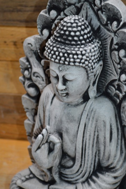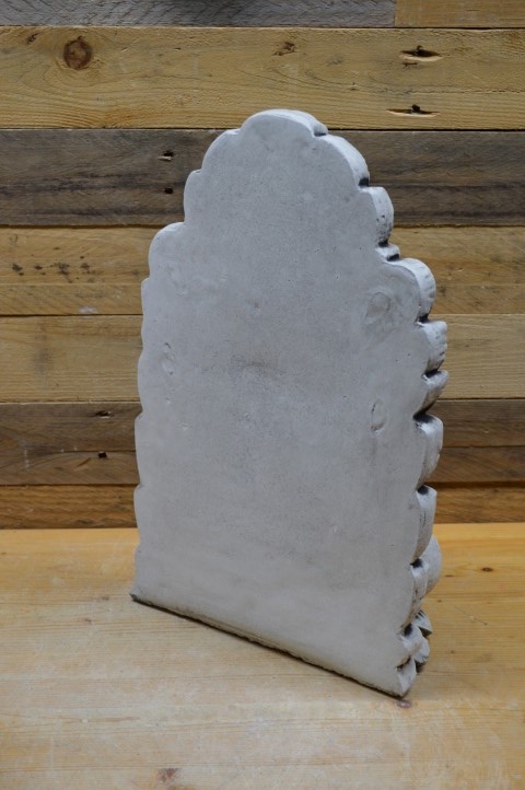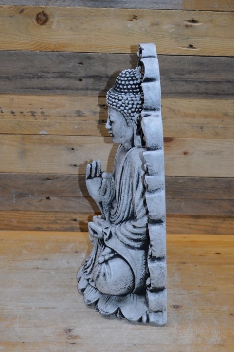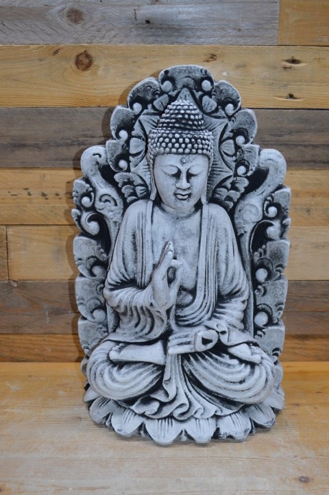 Dit betonnen beeld van Shiva toont de god in een zittende meditatiehouding voor een sierlijk bewerkte achtergrond. Het straalt een serene sfeer uit die rust en spiritualiteit brengt in elke ruimte. Het beeld is geschikt voor zowel binnen als buiten en is gemaakt van duurzaam beton. Een prachtig decoratief object voor liefhebbers van oosterse kunst en meditatie.